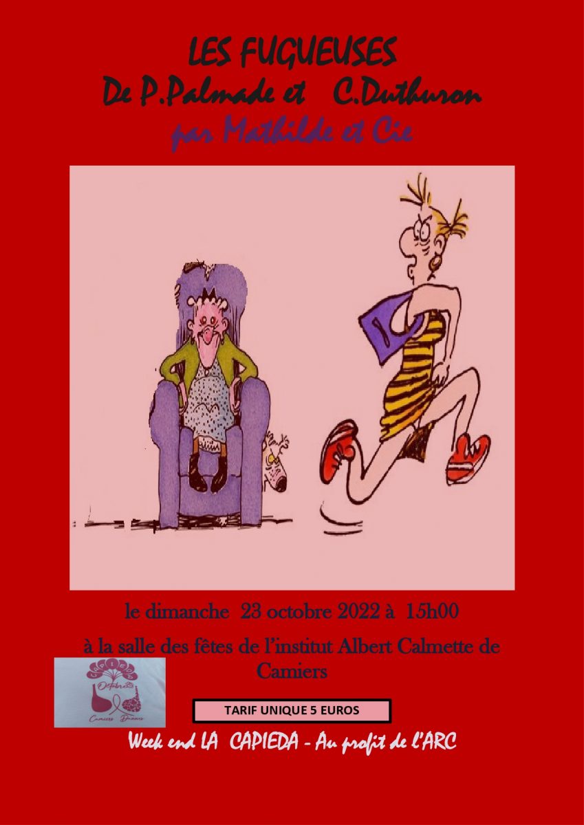 - Une pièce de Théâtre « Les Fugueuses » par la Compagnie Mathilde et Cie au profit de l’ARC – le Dimanche 23 octobre 2022 à 15h à la salle des Fêtes de l’Institut Albert Calmette de Camiers – Tarif unique à 5 euros
