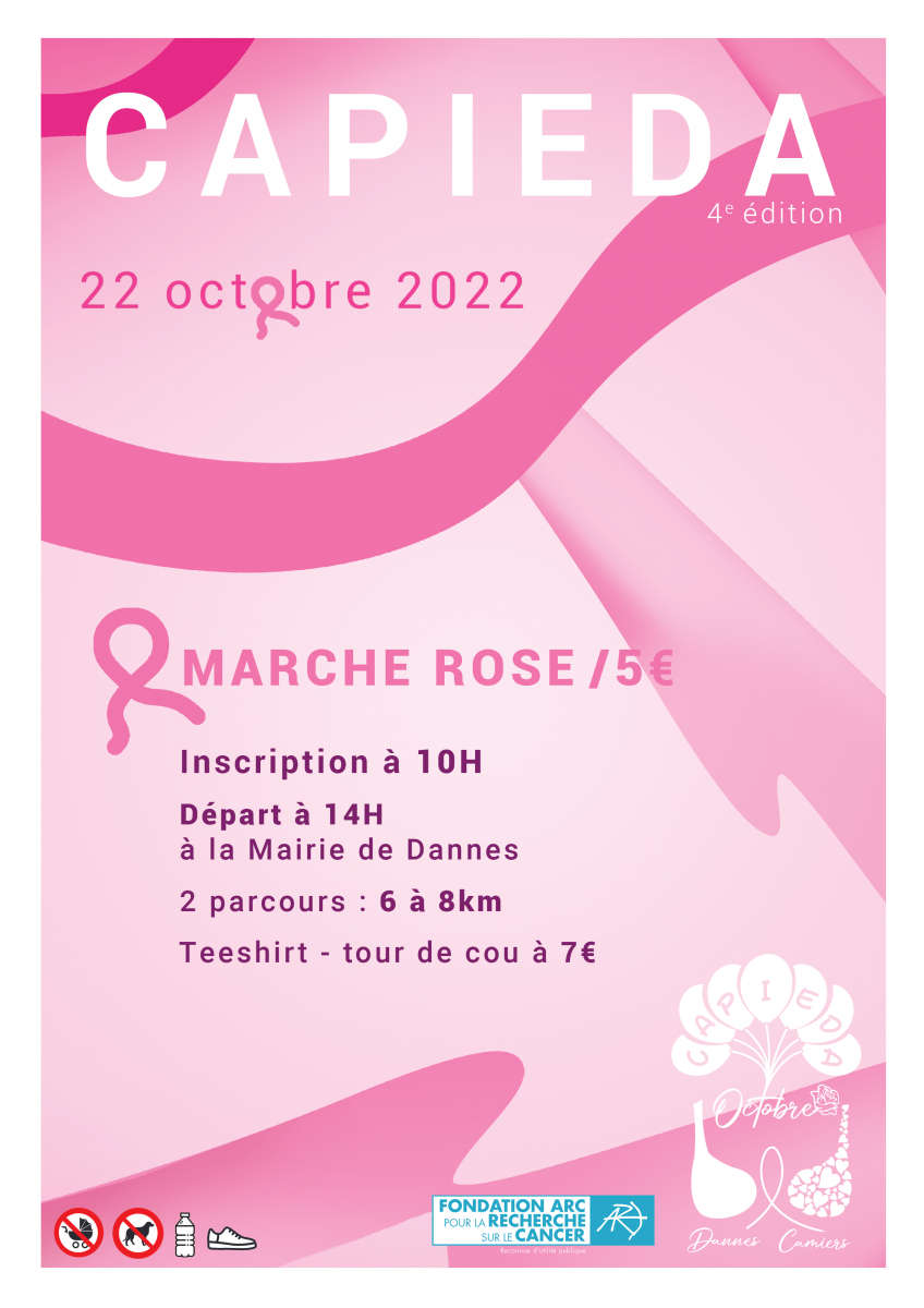 - La 4ème édition de La CAPIEDA – le samedi 22 octobre 2022 à 14h – Départ de Dannes devant la Mairie – Inscription à 10h à la Mairie de Dannes – 2 parcours de 6 à 10 kms. Tarif à 5 euros. La CAPIEDA vous proposera également un tour de cou – Tee-shirt au prix de 7 euros