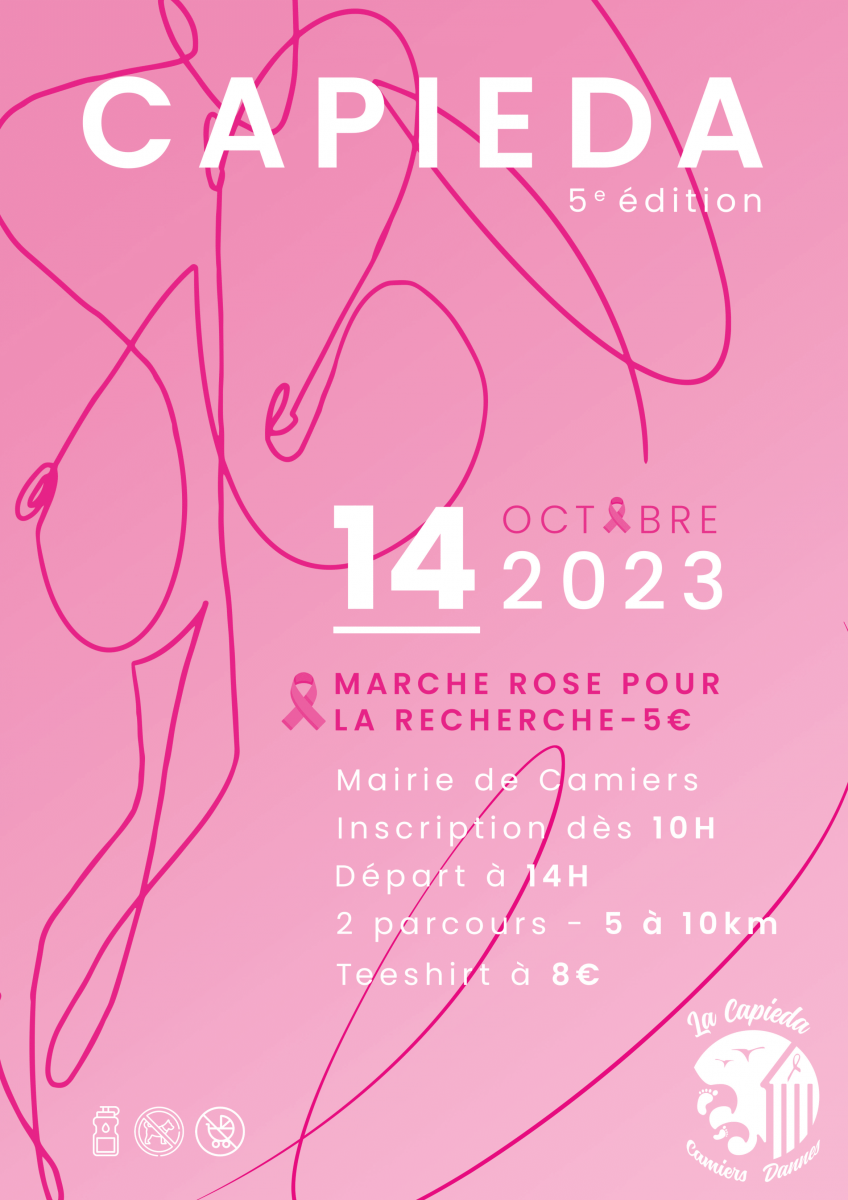 Pour la 5ème édition, une marche rose « CAPIEDA » pour la recherche – 5€- est organisée le 14 octobre 2023 – Départ à 14h devant la mairie de Camiers – Inscription dès 10h – 2 parcours de 5 à 10km – Tee-shirt en vente à 8€