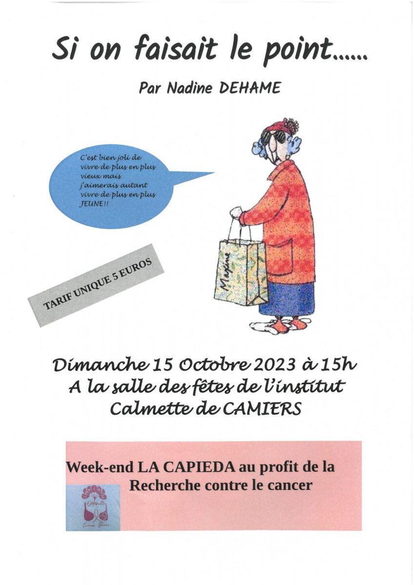 Le week-end sera prolongé avec une pièce de théâtre « Si on faisait le point… » par Nadine DEHAME au profit de la recherche contre le cancer